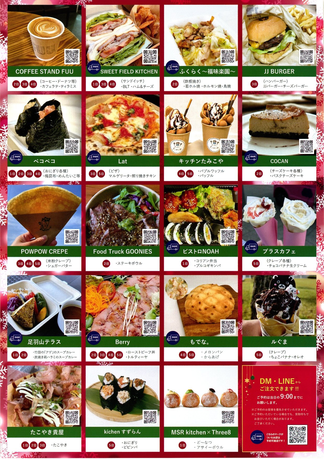 2025 12.01 月 2025 12.05 金 2025/12/1(月)~5(金)『冬のキッチンカーまつり』 ハピテラス 冬のキッチンカーまつり人気のキッチンカーがハピテラスに大集合!●日時: 12月1日(月)~5日(金) 全日程11:00~19:00●場所: ハピリン1階 ハピテラス●お問い合わせ: まちづくり福井(株) TEL:0776-30-0330 イベント一覧に戻る