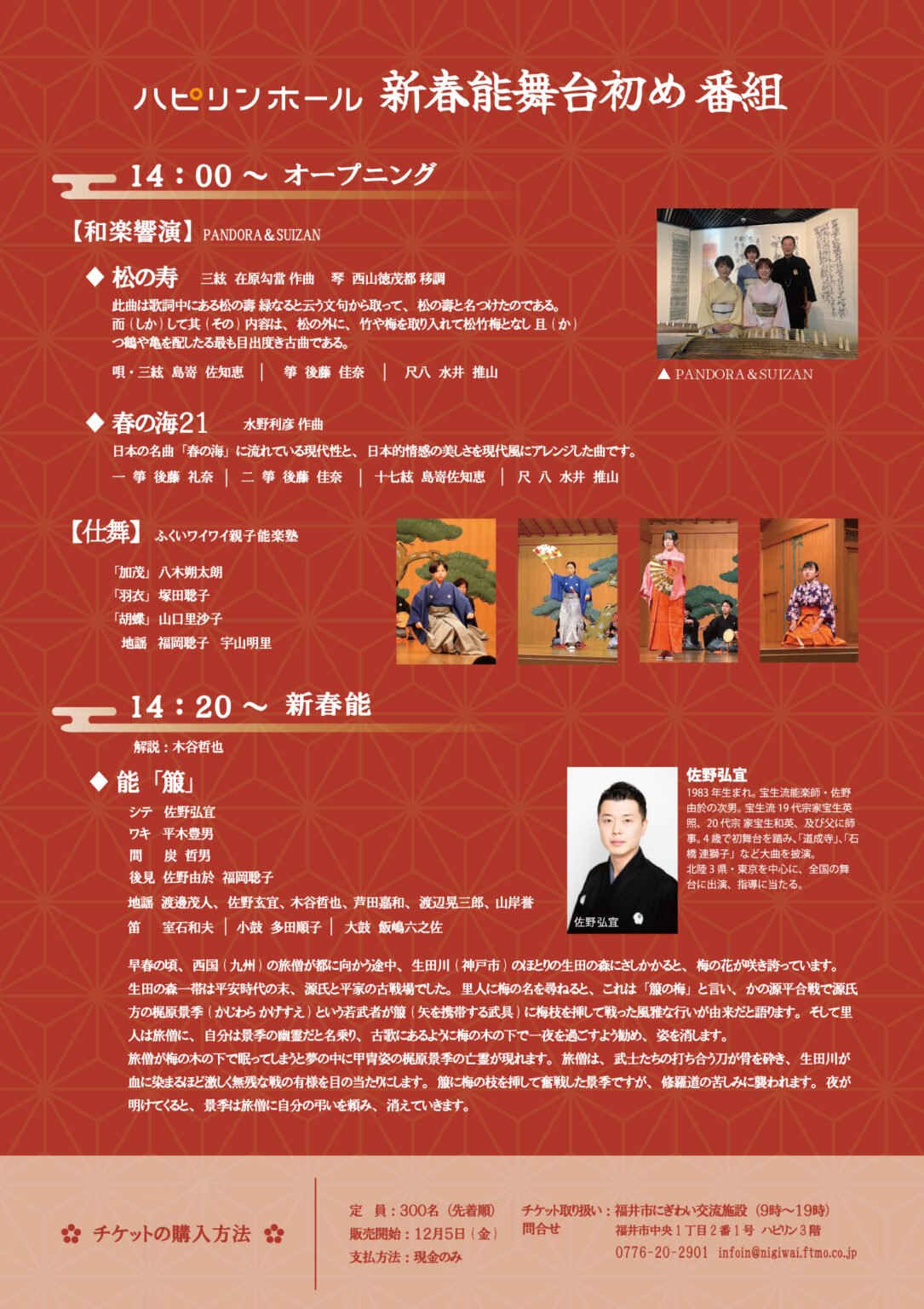 内 容 能舞台で伝統芸能を今まであまり見たことのない人にも気楽に楽しんでいただけるよう、ハピリンホール年頭の舞台初めとして開催します。 プロの能楽師による新春能をメインに、伝統芸能を子どもからあらゆる世代につなぐための演目を披露します。
