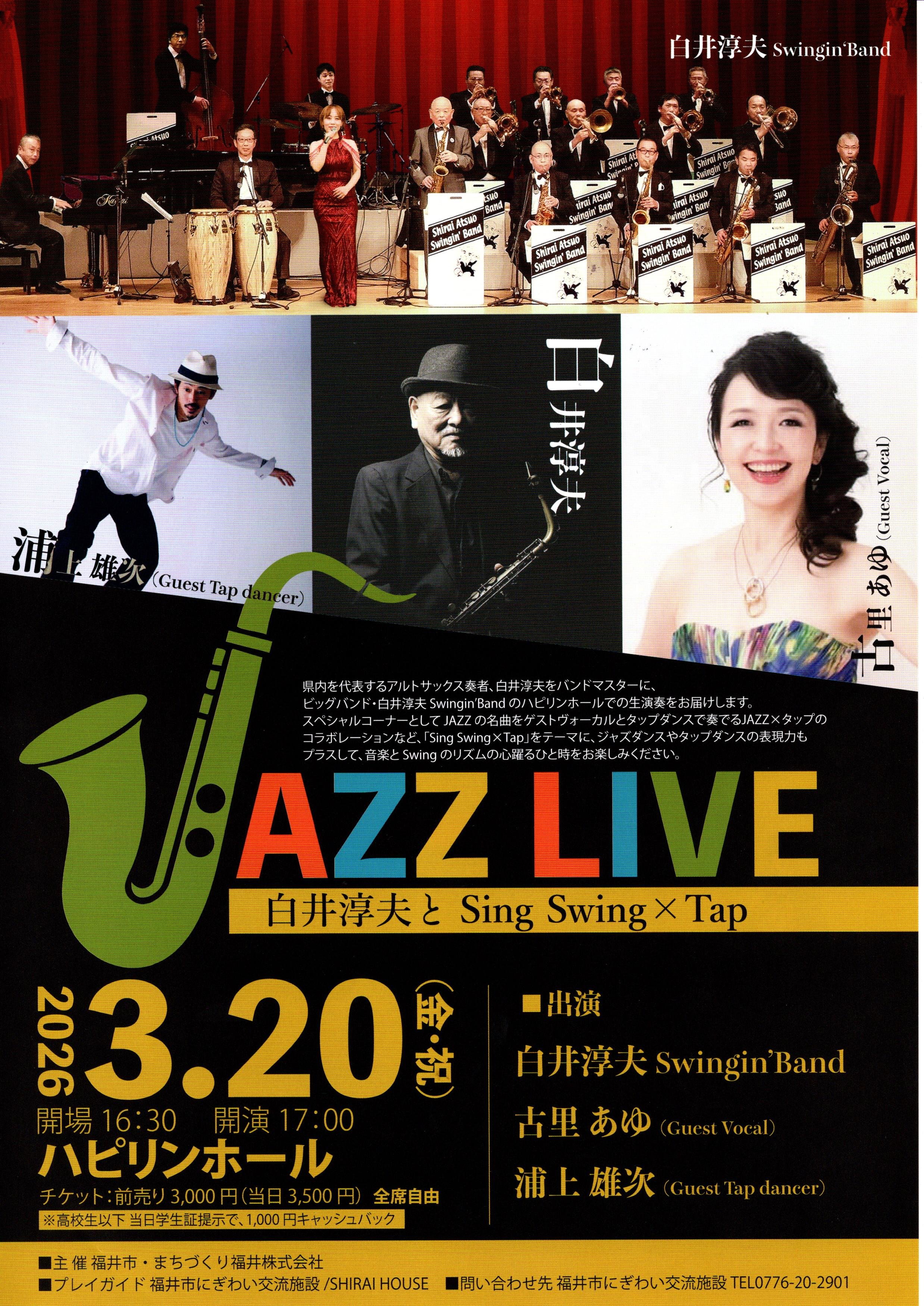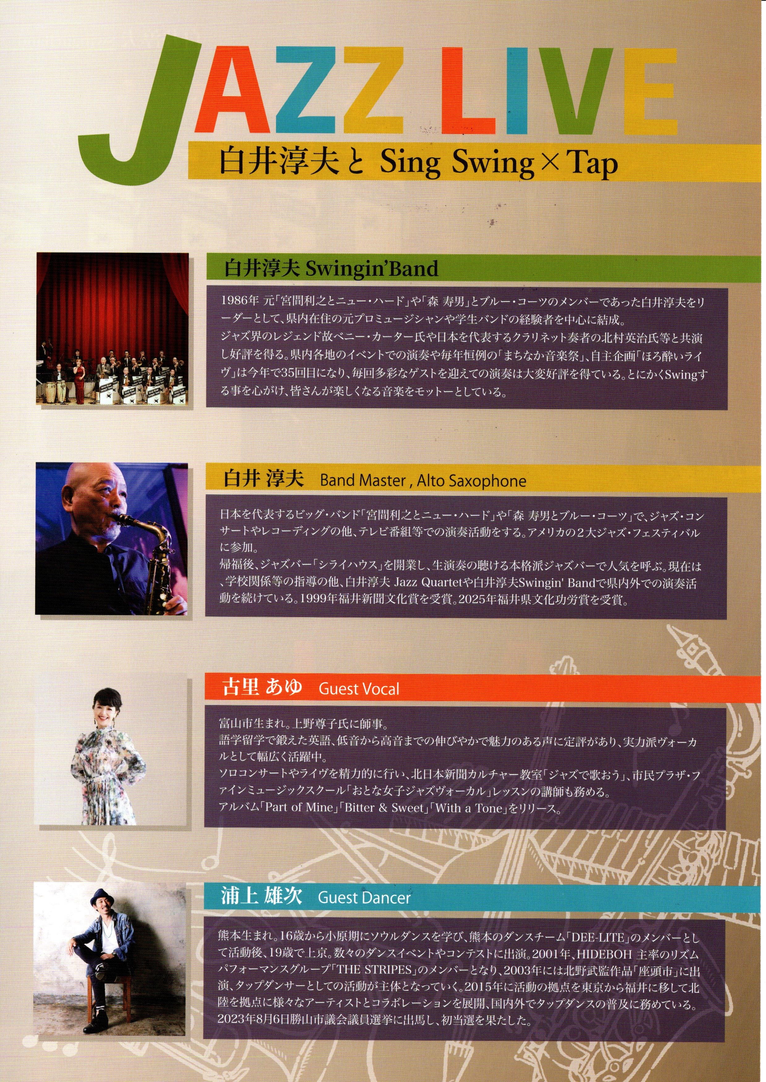 白井淳夫Swingin‘Band 18名 ゲスト・ヴォーカル 古里 あゆ ゲスト・タップダンサー 浦上 雄次