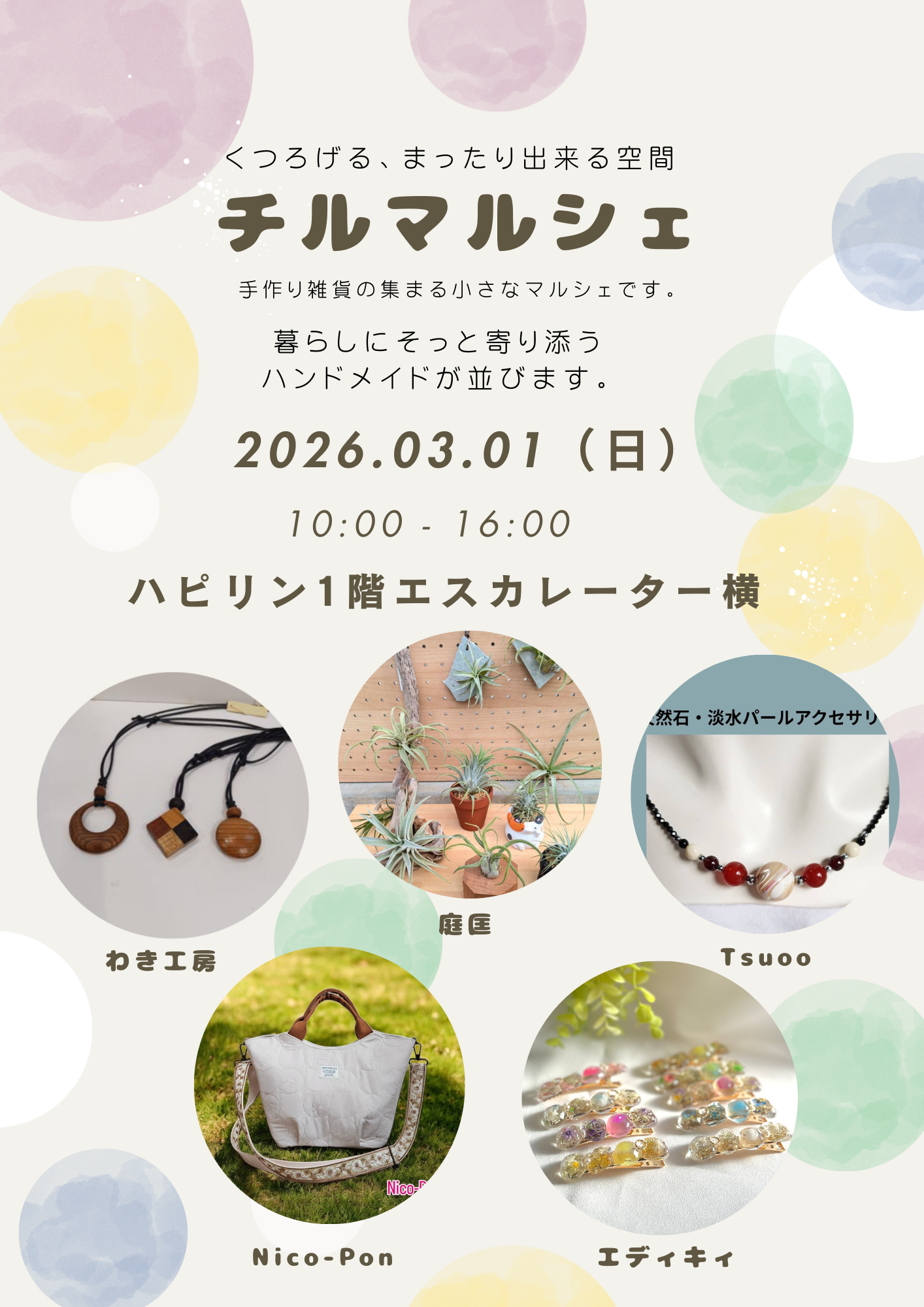 2026 03.01 日 2026/3/1(日)『チルマルシェ』 ハピリンモール くつろげる、まったりできる空間チルマルシェ手作り雑貨の集まる小さなマルシェです。暮らしにそっと寄り添うハンドメイドが並びます。日時2026年3月1日(日)10:00-16:00場所ハピリン1階エスカレーター横26/2/14 M イベント一覧に戻る