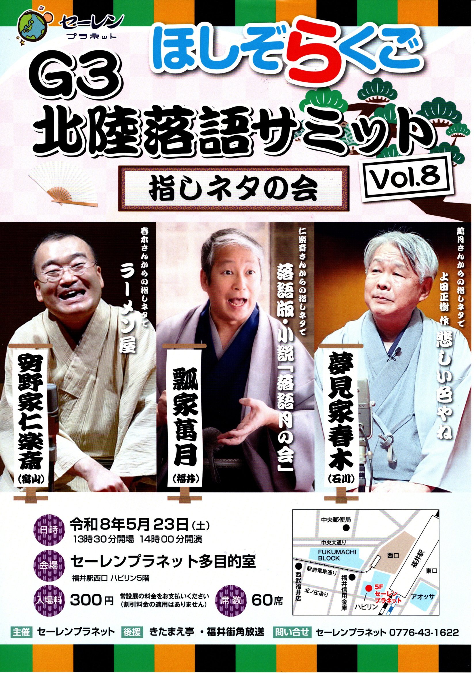 2026 05.23 土 2026/5/23(土)『ほしぞらくご G3社会人落語北陸サミット Vol.8』 セーレンプラネット ほしぞらくご G3社会人落語北陸サミット Vol.8指しネタの会日時2026年5月23日(土)午後2時開演(1時30分開場)会場セーレンプラネット多目的室(福井駅西口・ハピリン5F)出演瓢家萬月、夢見家春木、安野家仁楽斎料金300円(常設展入館料/60席)富山、石川、福井、北陸3県の年配社会人落語家3人の会でございます。26/04/13 M イベント一覧に戻る