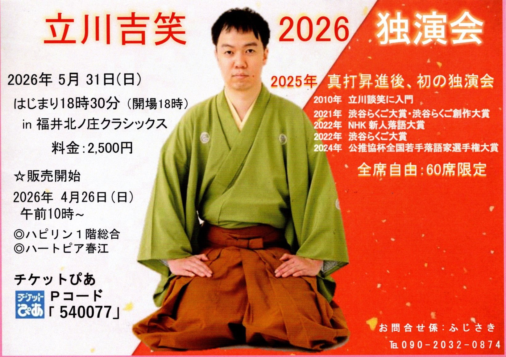 2026 05.31 日 2026/5/31(日)『立川吉笑独演会』 周辺情報 立川吉笑独演会日時2026年5月31日(日) 18:00開場 18:30開演会場北ノ庄クラシックス料金一般 2,500円(全席自由/60席限定)プレイガイドハピリン1F総合案内、ハートピア春江主催・お問い合わせあわららくご会(090-2032-0874) イベント一覧に戻る