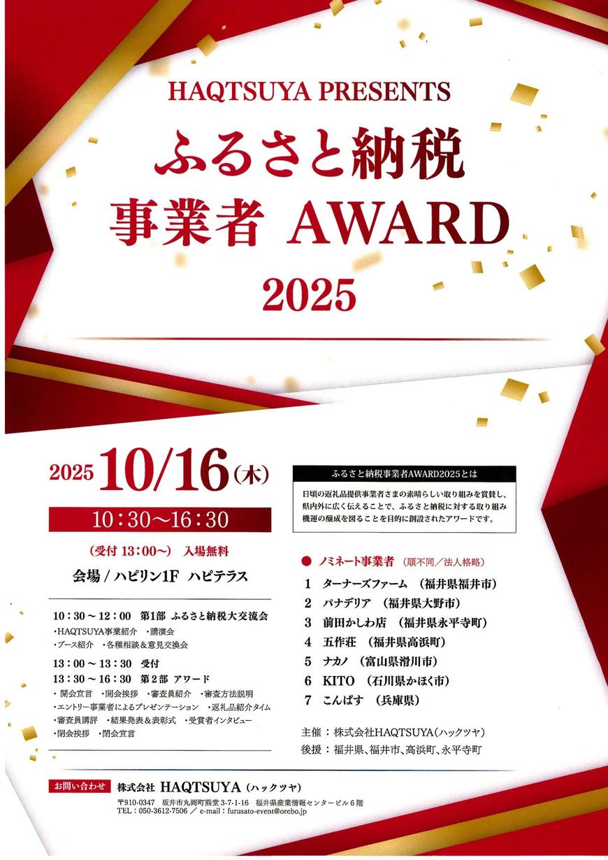 2025 10.16 木 2025/10/16(木)『HAQTSUYA PRESENTS ふるさと納税事業者 AWARD2025』 ハピリンホール HAQTSUYA PRESENTS ふるさと納税事業者 AWARD2025●日時: 10月16日(木) 10:30~16:30 ※詳しくは、以下チラシをご確認ください●場所: ハピリン1階 ハピテラス●お問い合わせ: 株式会社HAQTSUYA TEL:050-3612-7506 Email:furusata-event@orebo.jp イベント一覧に戻る