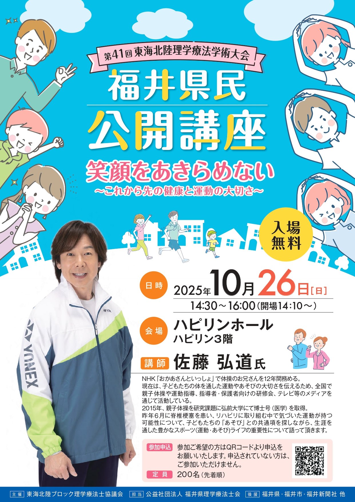 2025 10.26 日 2025/10/26(日)『福井県民 公開講座 笑顔をあきらめない』 ハピリンホール 第41回 東海北陸理学療法 学術大会 福井県民公開講座笑顔をあきらめない ~これから先の健康と運動の大切さ~●日時: 10月26日(日) 開場14:10 14:30~16:00●場所: ハピリン3階 ハピリンホール●主催: 東海北陸ブロック理学療法士協議会 ※お申し込み・お問い合わせは、以下QRからご確認ください イベント一覧に戻る