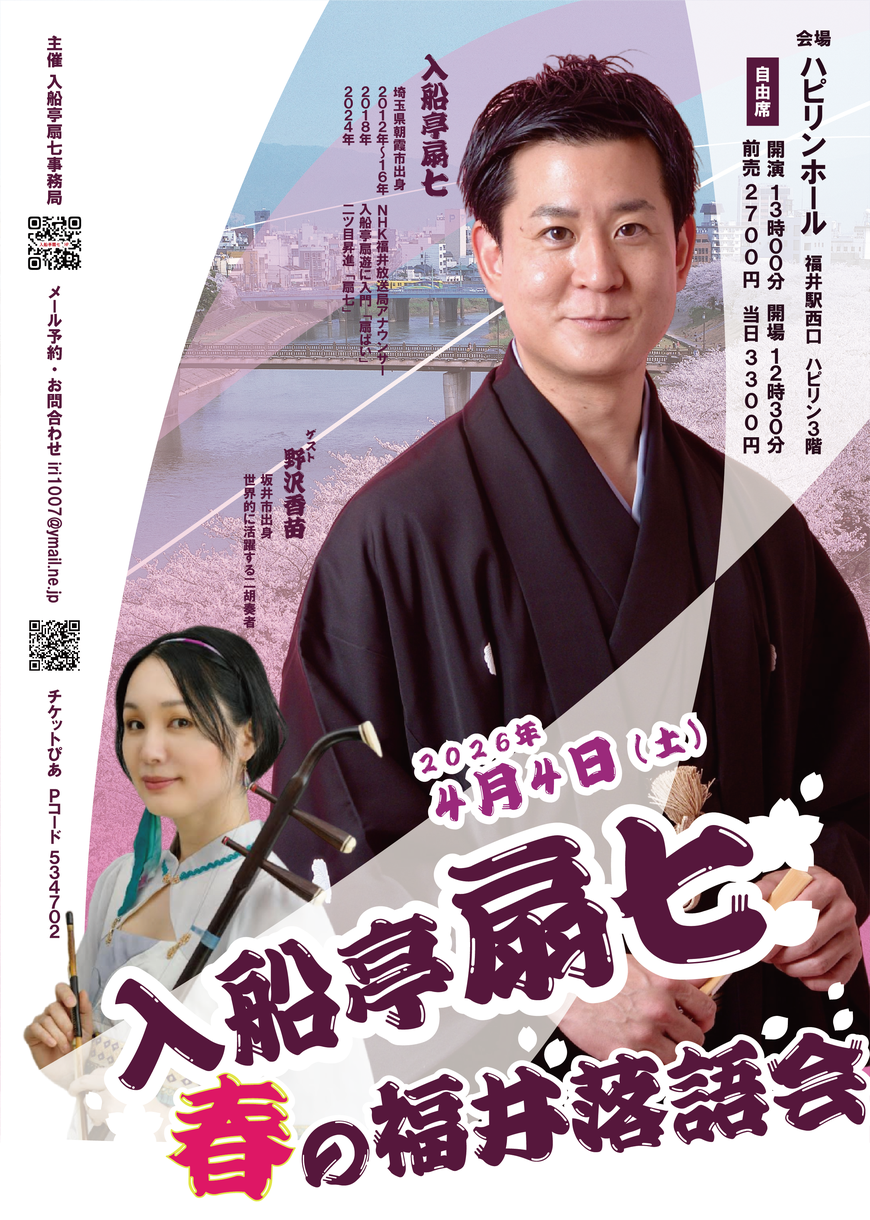 2026 04.04 土 2026/4/4(土)『入船亭扇七 春の福井落語会』 ハピリンホール 入船亭扇七 春の福井落語会日時2026年4月4日(土)開演13:00/会場13:30チケット前売:2,700円当日:3,300円(自由席)会場ハピリンホール福井駅西口ハピリン3階主催入船亭扇七事務局入船亭扇七事務局メール予約・お問い合わせiri1007@ymail.ne.jpチケット販売チケットぴあ Pコード 534702チケットぴあ25/10/17 O イベント一覧に戻る