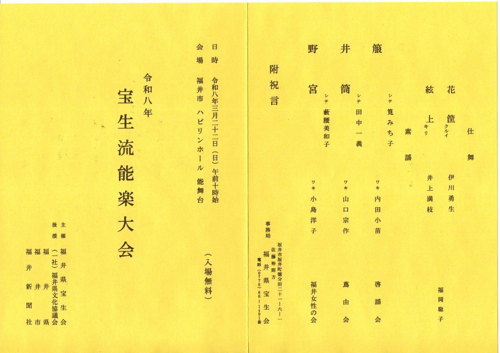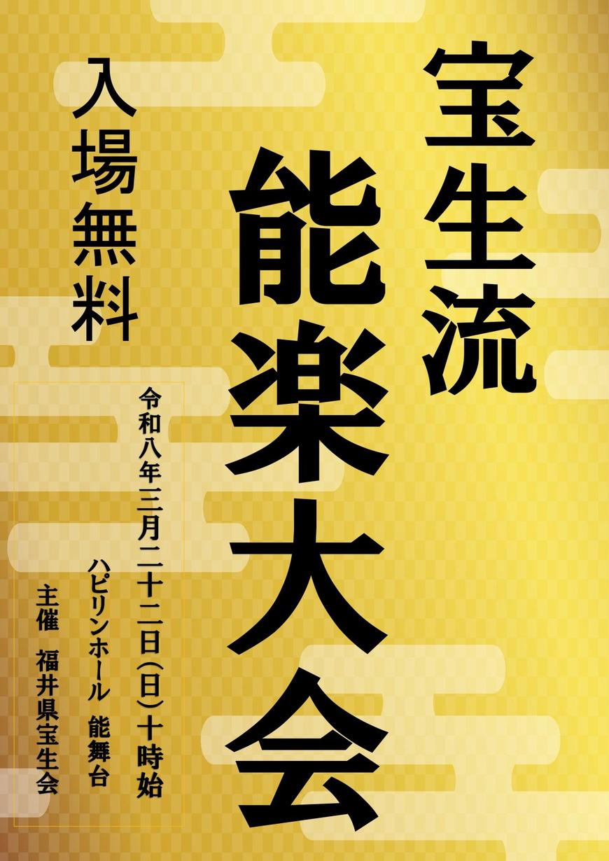 2026 03.22 日 2026/3/22(日)『宝生流能楽大会』 宝生流能楽大会日時3月22日(日)午前10時会場福井市ハピリンホール 能舞台入場料無料主催福井宝生会(0778‐66‐1491)260309.F イベント一覧に戻る