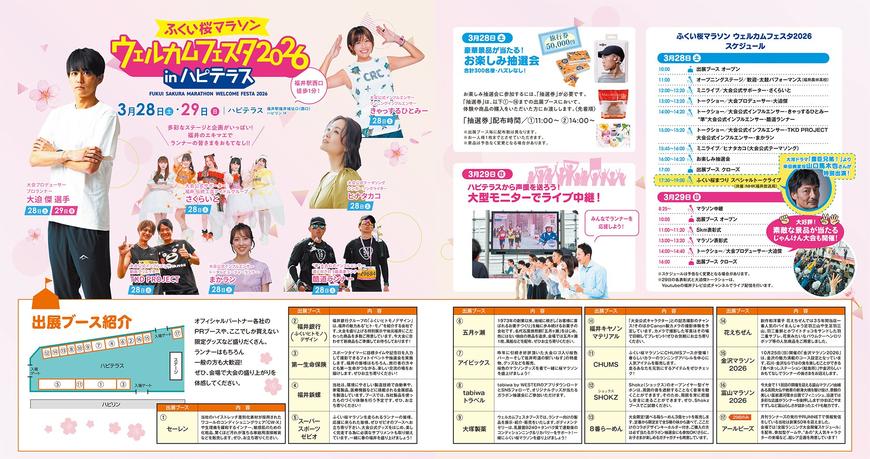 ふくい桜マラソン2026のオフィシャルパートナー(協賛社)や連携マラソン大会のPRのほか、マラソン関連グッズの販売など盛りだくさん。